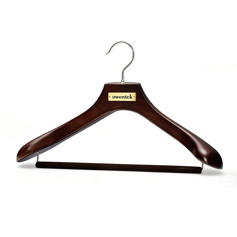 This "owentek" - branded wooden hanger is meticulously crafted from high - quality wood, with a deep brown appearance exuding elegance. The hanger features smooth shoulder lines that perfectly conform to the contours of clothing, effectively preventing shoulder distortion. The sturdy and sleek metal hook is convenient to use, and the bottom cross - bar is a practical design, allowing trousers and other garments to be easily hung, saving closet space. In addition, we offer a customization service. The brand logo can be printed according to your requirements, making this hanger an exclusive storage item for your boutiques, high - end brands, or home wardrobes, showcasing unique taste and style.