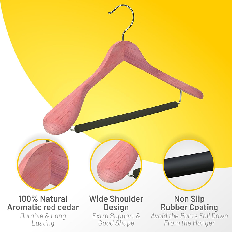 Eco-Natural & Fragrant Cedar: 5-pack hangers crafted from 100% natural red cedar wood (no paint), emitting long-lasting aromatic scent to freshen closets. Size: 17.5"L x 10.63"H, extra wide shoulders (2.3").