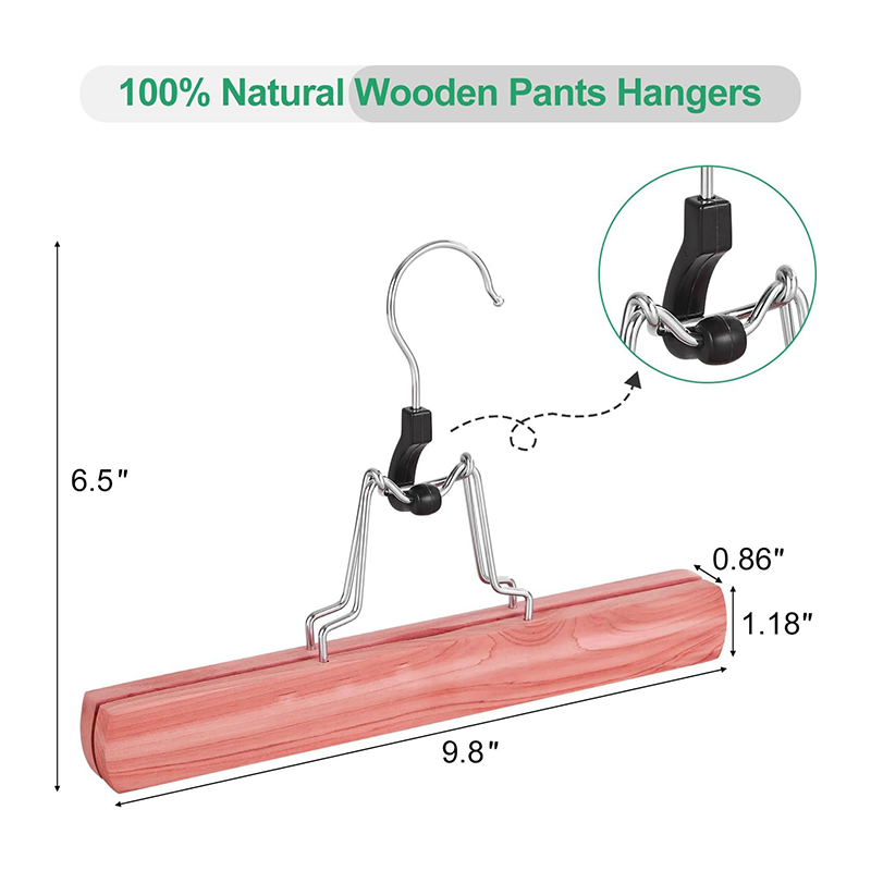 Multi-Purpose Use:Equipped with two flat wooden bars, the hangers have strong clamping force. They work perfectly for hanging slacks, casual pants, skirts, jeans, shorts, leggings, hair extensions, and more.